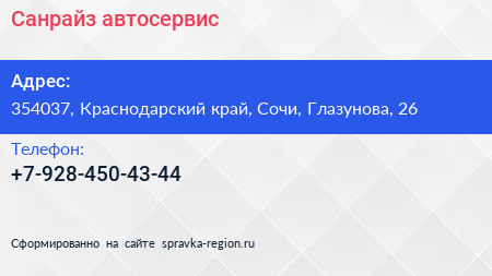 Санрайз, автосервис по адресу 354037, Краснодарский край, Сочи, Глазунова, 26 в дальнейшем Организация, размещена в следующих категориях: