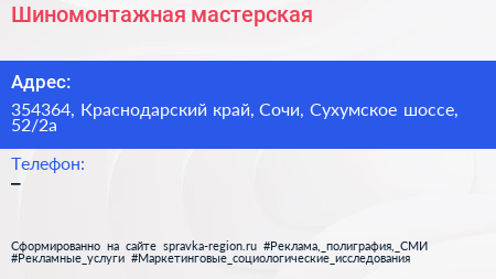 Шиномонтажная мастерская по адресу 354364, Краснодарский край, Сочи, Сухумское шоссе, 52/2а в дальнейшем Организация, размещена в следующих категориях: