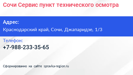 Сочи Сервис, пункт технического осмотра по адресу Краснодарский край, Сочи, Джапаридзе, 1/3 в дальнейшем Организация, размещена в следующих категориях: