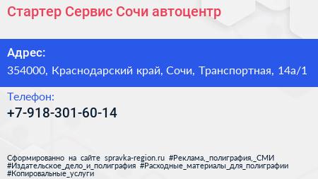 Стартер Сервис Сочи, автоцентр по адресу 354000, Краснодарский край, Сочи, Транспортная, 14а/1 в дальнейшем Организация, размещена в следующих категориях: