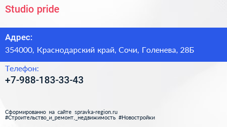 Studio pride по адресу 354000, Краснодарский край, Сочи, Голенева, 28Б в дальнейшем Организация, размещена в следующих категориях: