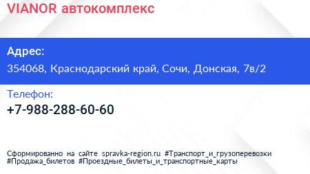 VIANOR, автокомплекс по адресу 354068, Краснодарский край, Сочи, Донская, 7в/2 в дальнейшем Организация, размещена в следующих категориях: