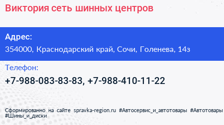 Виктория, сеть шинных центров по адресу 354000, Краснодарский край, Сочи, Голенева, 14з в дальнейшем Организация, размещена в следующих категориях: