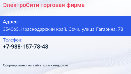 ЭлектроСити, торговая фирма по адресу 354065, Краснодарский край, Сочи, улица Гагарина, 78 в дальнейшем Организация, размещена в следующих категориях: