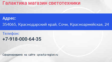 Галактика, магазин светотехники по адресу 354065, Краснодарский край, Сочи, Красноармейская, 24 в дальнейшем Организация, размещена в следующих категориях: