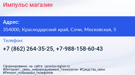 Импульс, магазин по адресу 354000, Краснодарский край, Сочи, Московская, 5 в дальнейшем Организация, размещена в следующих категориях: