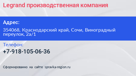Legrand, производственная компания по адресу 354068, Краснодарский край, Сочи, Виноградный переулок, 2а/1 в дальнейшем Организация, размещена в следующих категориях: