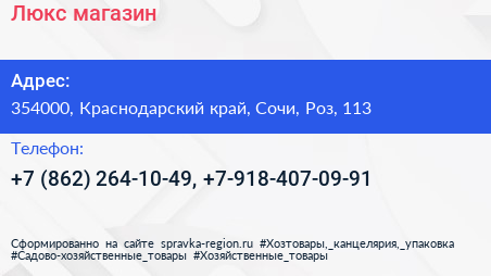 Люкс, магазин по адресу 354000, Краснодарский край, Сочи, Роз, 113 в дальнейшем Организация, размещена в следующих категориях:
