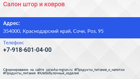 Салон штор и ковров по адресу 354000, Краснодарский край, Сочи, Роз, 95 в дальнейшем Организация, размещена в следующих категориях: