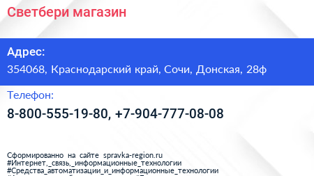 Светбери, магазин по адресу 354068, Краснодарский край, Сочи, Донская, 28ф в дальнейшем Организация, размещена в следующих категориях: