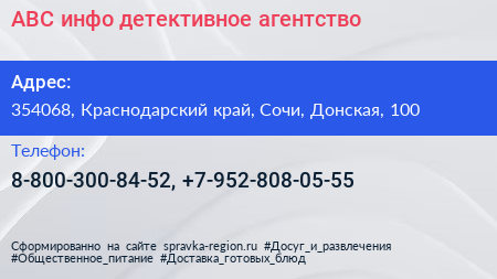 АВС инфо, детективное агентство по адресу 354068, Краснодарский край, Сочи, Донская, 100 в дальнейшем Организация, размещена в следующих категориях: