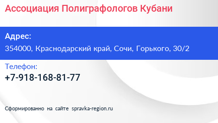 Ассоциация Полиграфологов Кубани по адресу 354000, Краснодарский край, Сочи, Горького, 30/2 в дальнейшем Организация, размещена в следующих категориях: