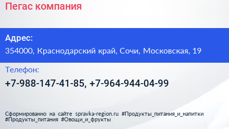 Пегас, компания по адресу 354000, Краснодарский край, Сочи, Московская, 19 в дальнейшем Организация, размещена в следующих категориях: