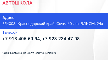 АВТОШКОЛА по адресу 354003, Краснодарский край, Сочи, 60 лет ВЛКСМ, 24а в дальнейшем Организация, размещена в следующих категориях: