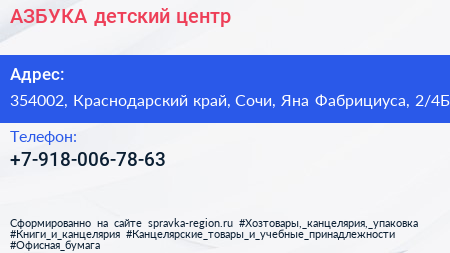 АЗБУКА, детский центр по адресу 354002, Краснодарский край, Сочи, Яна Фабрициуса, 2/4Б в дальнейшем Организация, размещена в следующих категориях: