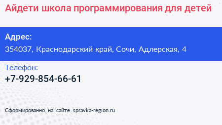 Айдети, школа программирования для детей по адресу 354037, Краснодарский край, Сочи, Адлерская, 4 в дальнейшем Организация, размещена в следующих категориях: