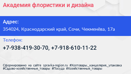 Академия флористики и дизайна по адресу 354024, Краснодарский край, Сочи, Чекменёва, 17а в дальнейшем Организация, размещена в следующих категориях: