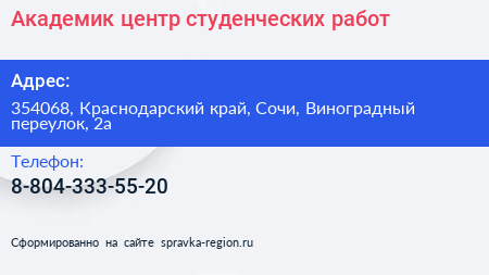 Академик, центр студенческих работ по адресу 354068, Краснодарский край, Сочи, Виноградный переулок, 2а в дальнейшем Организация, размещена в следующих категориях:
