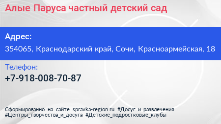 Алые Паруса, частный детский сад по адресу 354065, Краснодарский край, Сочи, Красноармейская, 18 в дальнейшем Организация, размещена в следующих категориях: