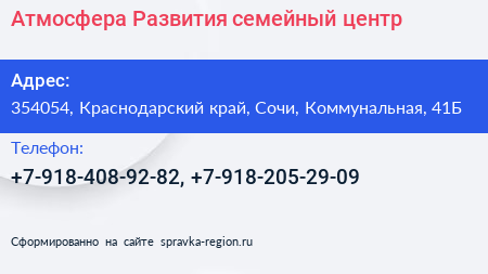Атмосфера Развития, семейный центр по адресу 354054, Краснодарский край, Сочи, Коммунальная, 41Б в дальнейшем Организация, размещена в следующих категориях: