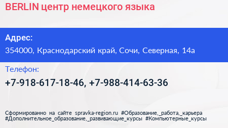 BERLIN, центр немецкого языка по адресу 354000, Краснодарский край, Сочи, Северная, 14а в дальнейшем Организация, размещена в следующих категориях: