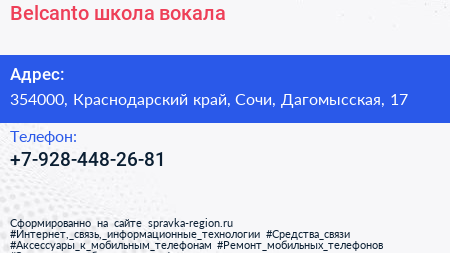 Belcanto, школа вокала по адресу 354000, Краснодарский край, Сочи, Дагомысская, 17 в дальнейшем Организация, размещена в следующих категориях: