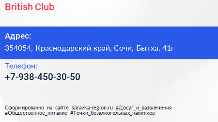 British Club по адресу 354054, Краснодарский край, Сочи, Бытха, 41г в дальнейшем Организация, размещена в следующих категориях: