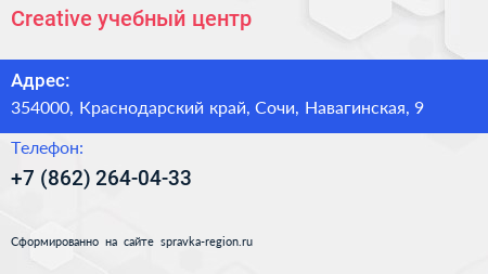 Creative, учебный центр по адресу 354000, Краснодарский край, Сочи, Навагинская, 9 в дальнейшем Организация, размещена в следующих категориях: