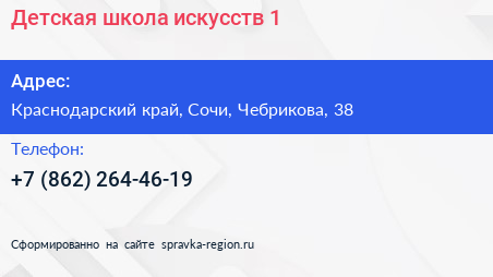 Детская школа искусств №1 по адресу Краснодарский край, Сочи, Чебрикова, 38 в дальнейшем Организация, размещена в следующих категориях: