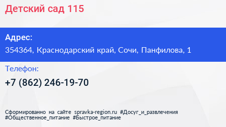 Детский сад №115 по адресу 354364, Краснодарский край, Сочи, Панфилова, 1 в дальнейшем Организация, размещена в следующих категориях: