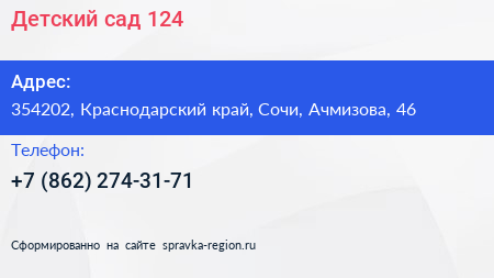 Детский сад №124 по адресу 354202, Краснодарский край, Сочи, Ачмизова, 46 в дальнейшем Организация, размещена в следующих категориях: