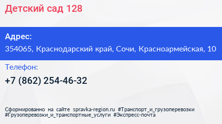 Детский сад №128 по адресу 354065, Краснодарский край, Сочи, Красноармейская, 10 в дальнейшем Организация, размещена в следующих категориях: