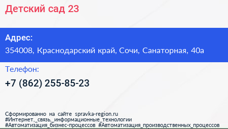 Детский сад №23 по адресу 354008, Краснодарский край, Сочи, Санаторная, 40а в дальнейшем Организация, размещена в следующих категориях: