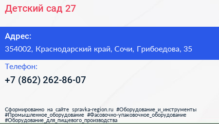 Детский сад №27 по адресу 354002, Краснодарский край, Сочи, Грибоедова, 35 в дальнейшем Организация, размещена в следующих категориях: