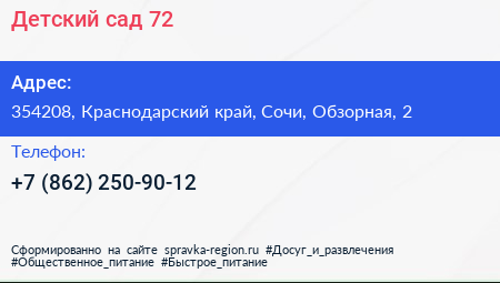 Детский сад №72 по адресу 354208, Краснодарский край, Сочи, Обзорная, 2 в дальнейшем Организация, размещена в следующих категориях: