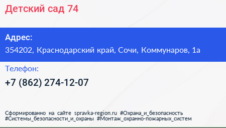 Детский сад №74 по адресу 354202, Краснодарский край, Сочи, Коммунаров, 1а в дальнейшем Организация, размещена в следующих категориях: