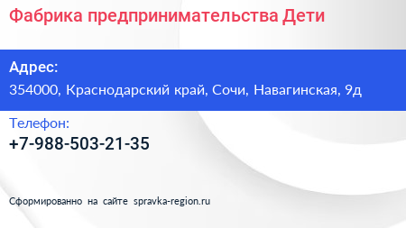 Фабрика предпринимательства-Дети по адресу 354000, Краснодарский край, Сочи, Навагинская, 9д в дальнейшем Организация, размещена в следующих категориях: