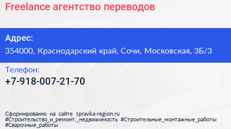 Freelance, агентство переводов по адресу 354000, Краснодарский край, Сочи, Московская, 3Б/3 в дальнейшем Организация, размещена в следующих категориях: