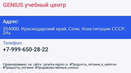GENIUS, учебный центр по адресу 354000, Краснодарский край, Сочи, Конституции СССР, 24а в дальнейшем Организация, размещена в следующих категориях: