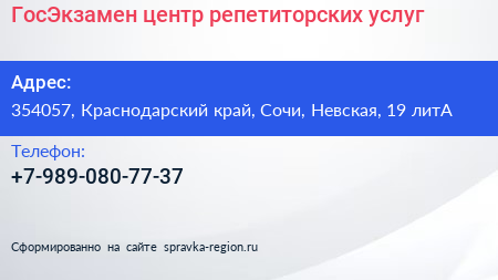 ГосЭкзамен, центр репетиторских услуг по адресу 354057, Краснодарский край, Сочи, Невская, 19 литА в дальнейшем Организация, размещена в следующих категориях: