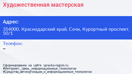 Художественная мастерская по адресу 354000, Краснодарский край, Сочи, Курортный проспект, 50/1 в дальнейшем Организация, размещена в следующих категориях:
