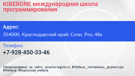 KIBERONE, международная школа программирования по адресу 354000, Краснодарский край, Сочи, Роз, 48а в дальнейшем Организация, размещена в следующих категориях: