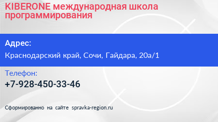 KIBERONE, международная школа программирования по адресу Краснодарский край, Сочи, Гайдара, 20а/1 в дальнейшем Организация, размещена в следующих категориях: