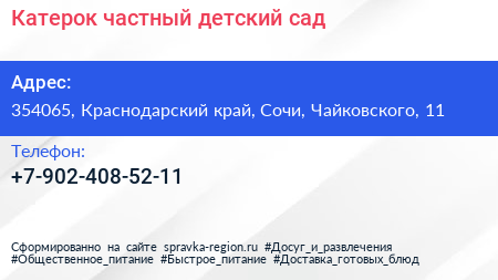 Катерок, частный детский сад по адресу 354065, Краснодарский край, Сочи, Чайковского, 11 в дальнейшем Организация, размещена в следующих категориях: