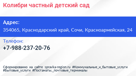 Колибри, частный детский сад по адресу 354065, Краснодарский край, Сочи, Красноармейская, 24 в дальнейшем Организация, размещена в следующих категориях: