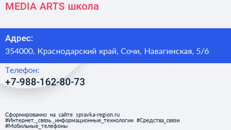 MEDIA ARTS, школа по адресу 354000, Краснодарский край, Сочи, Навагинская, 5/6 в дальнейшем Организация, размещена в следующих категориях: