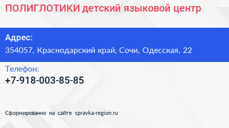 ПОЛИГЛОТИКИ, детский языковой центр по адресу 354057, Краснодарский край, Сочи, Одесская, 22 в дальнейшем Организация, размещена в следующих категориях: