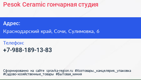 Pesok Ceramic, гончарная студия по адресу Краснодарский край, Сочи, Сулимовка, 6 в дальнейшем Организация, размещена в следующих категориях: