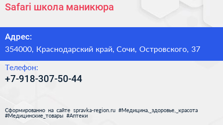 Safari, школа маникюра по адресу 354000, Краснодарский край, Сочи, Островского, 37 в дальнейшем Организация, размещена в следующих категориях: