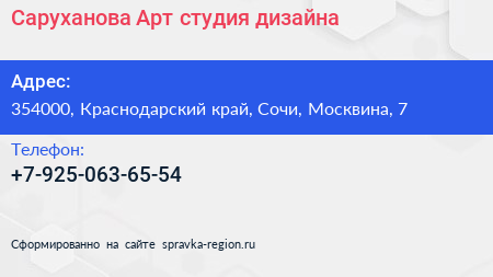 Саруханова-Арт, студия дизайна по адресу 354000, Краснодарский край, Сочи, Москвина, 7 в дальнейшем Организация, размещена в следующих категориях: